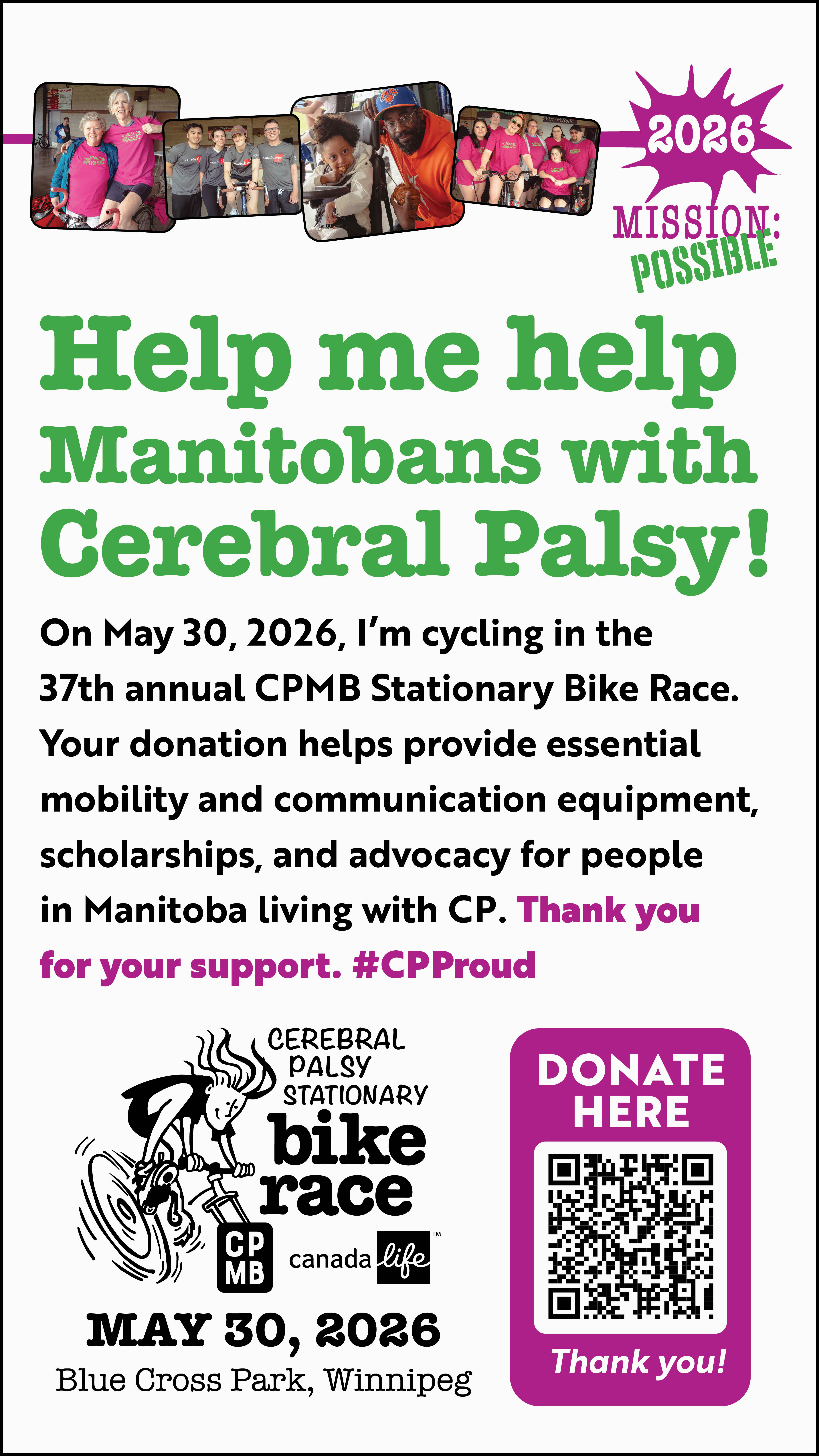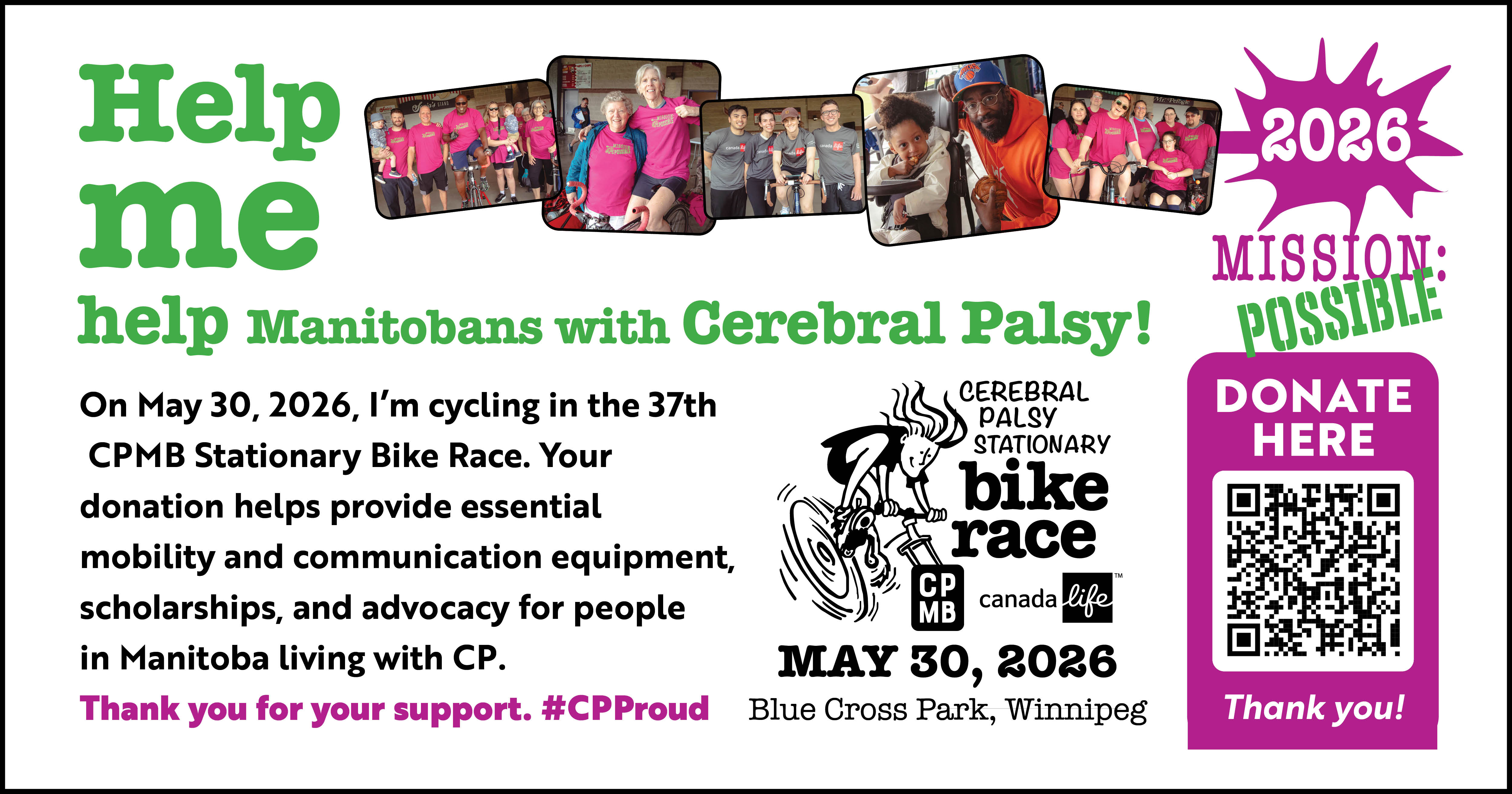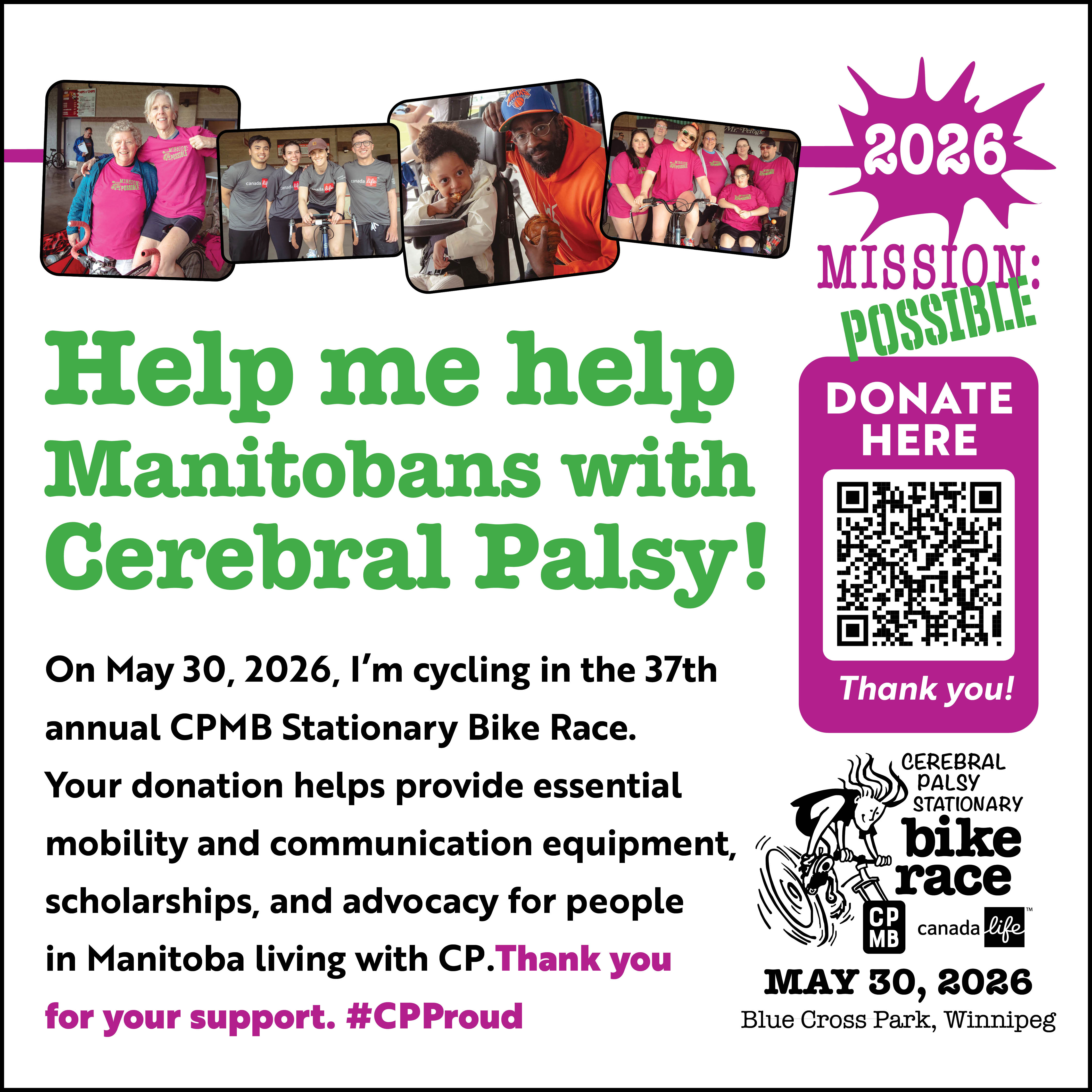 I am riding in CPMB’s 37th annual Stationary Bike Race on Saturday, May 30, 2026 at Blue Cross Park. Your donation directly impacts individuals affected by CP and provides grants for specialized mobility and communication equipment, scholarships, as well as advocacy for accessibility and human rights issues. Thank you for considering my request. #CPProud