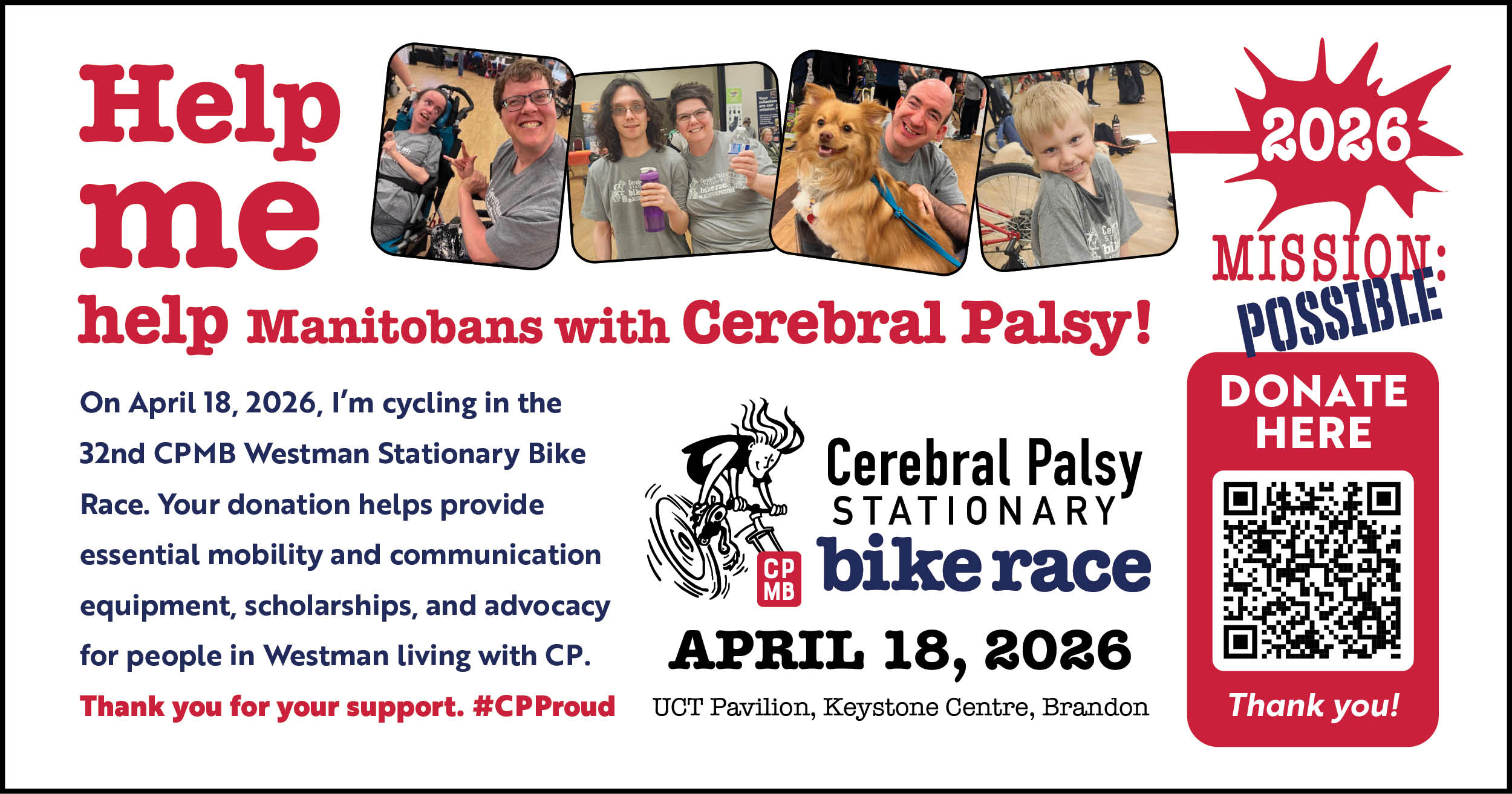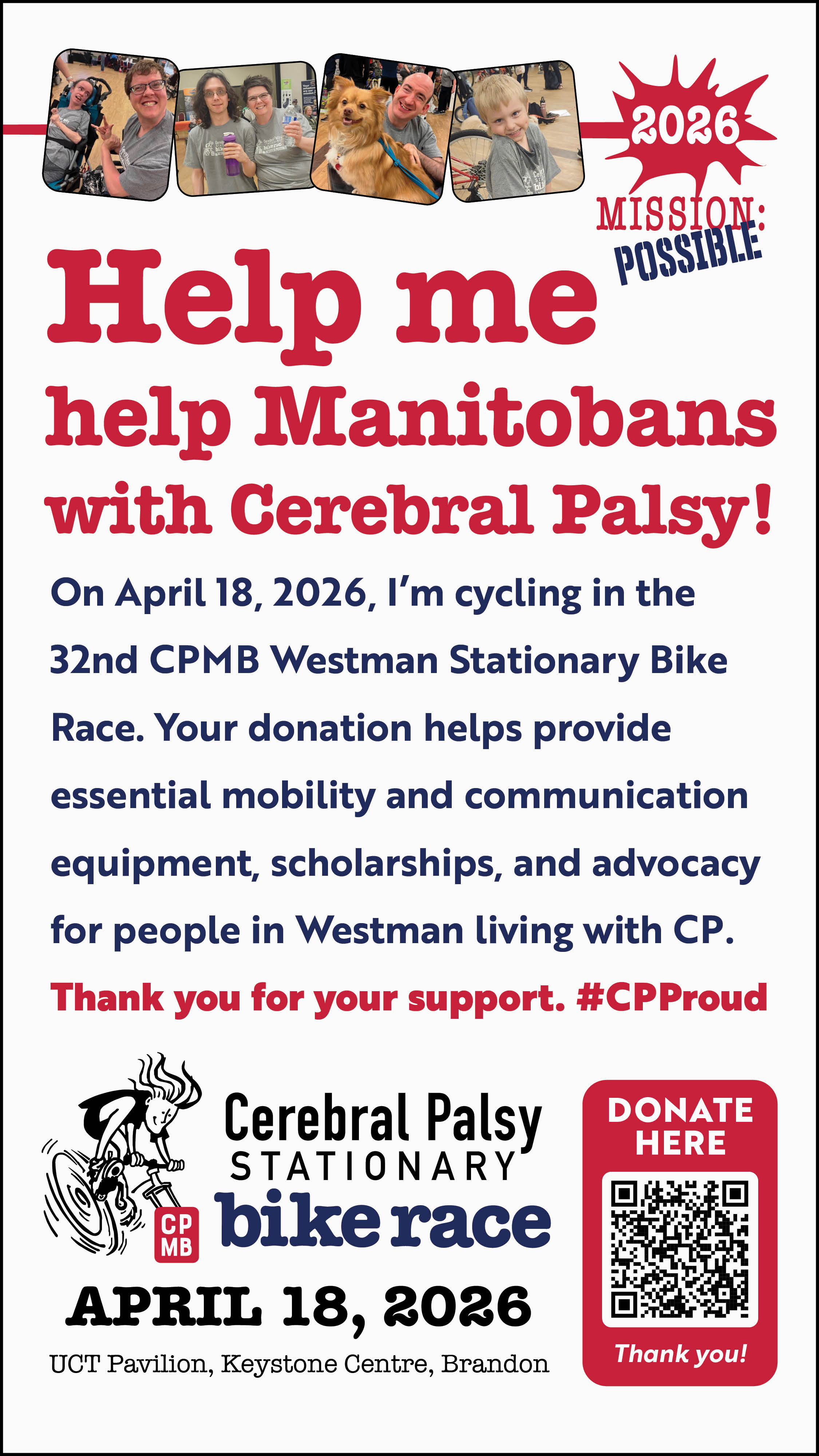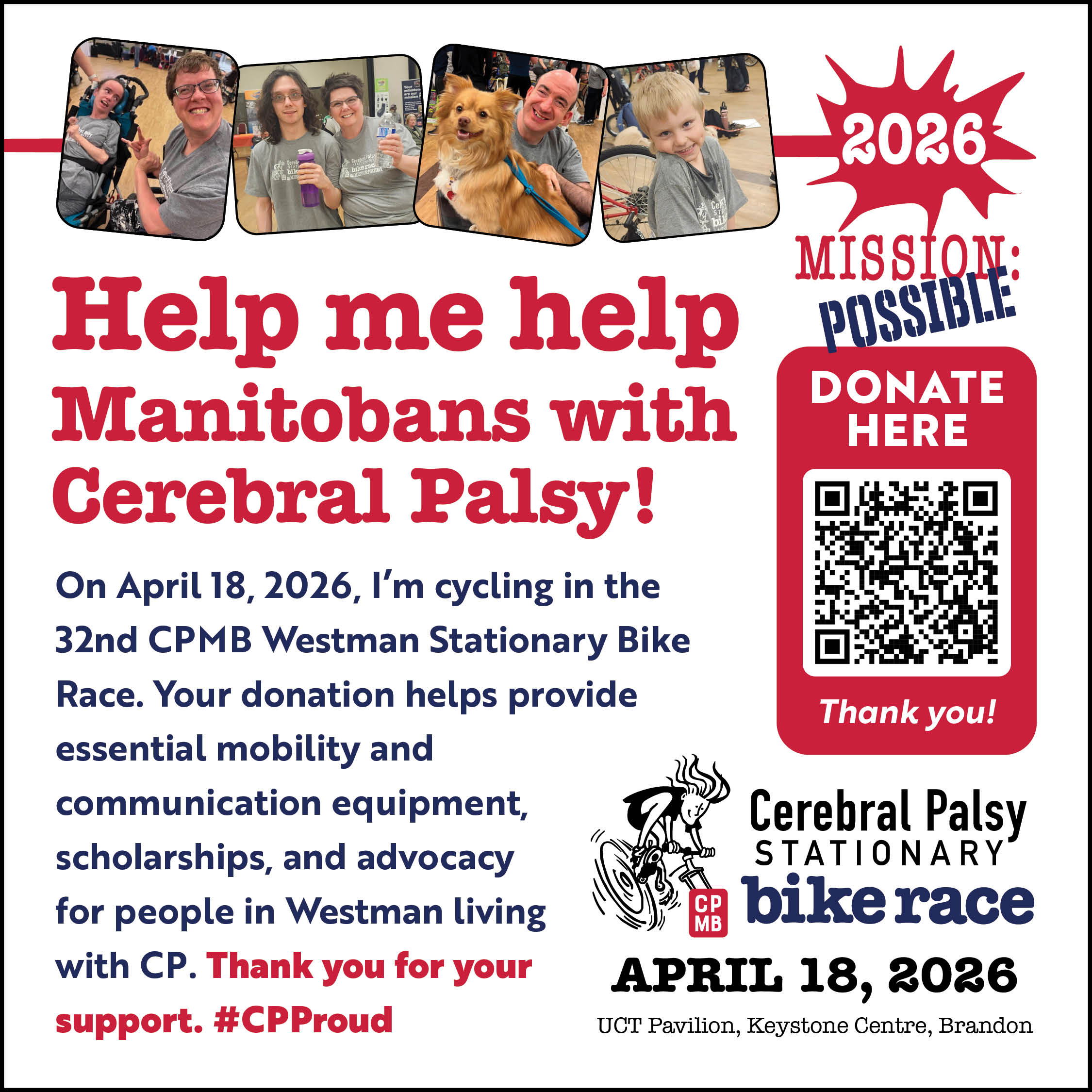 I am riding in CPMB Westman’s 32nd annual Stationary Bike Race on Saturday, April 18, 2026 at the Keystone Centre. Your donation directly impacts individuals affected by CP and provides grants for specialized mobility and communication equipment, scholarships, as well as advocacy for accessibility and human rights issues. Thank you for considering my request. #CPProud